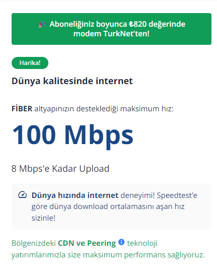 Geçen gün taahhüt bitti ve tekrar arayıp daha yüsek hızda paket yapmak için Vodafone'un internet sitesinden girip altyapı sorguladım. Bir baktım ki 100 Mbps hıza kadar destekliyordu. Hemen Vodafone'u aradım ve müşteri hizmetleri altyapınız en fazla 10 Mbps destekliyor ve başka operatore geçseniz de en fazla 10 verir dedi(komşularda fiber var.) Göknet ve TurkNet sonuçları bunlar. Şimdi ben TurkNet'e geçsem 100'e yakın hız alır mıyım yoksa problem yaşar mıyım? Çünkü Vodafone'un kendi sitesinde de 100'e kadar destekliyor diyordu. Yazı biraz uzun oldu kusura bakmayın.