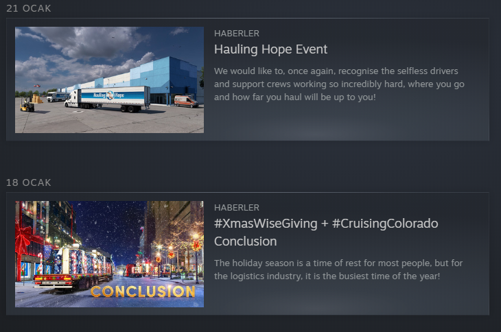 Bazı özel zamanlar etkinlikler geliyor oyuna. Mesela yılbaşı, corona zamanı geldi, aşı çıkınca geldi. Dorse ile aşı taşıyorduk.yıkılan İtalya köprüsü'nün açılışına özel geldi. Bu tarz oyunla ilgili olabilecek zamanlar için etkinlik getirebiliyorlar. Çok sık değil tabii ki. Yılda 3-4 kez falan.