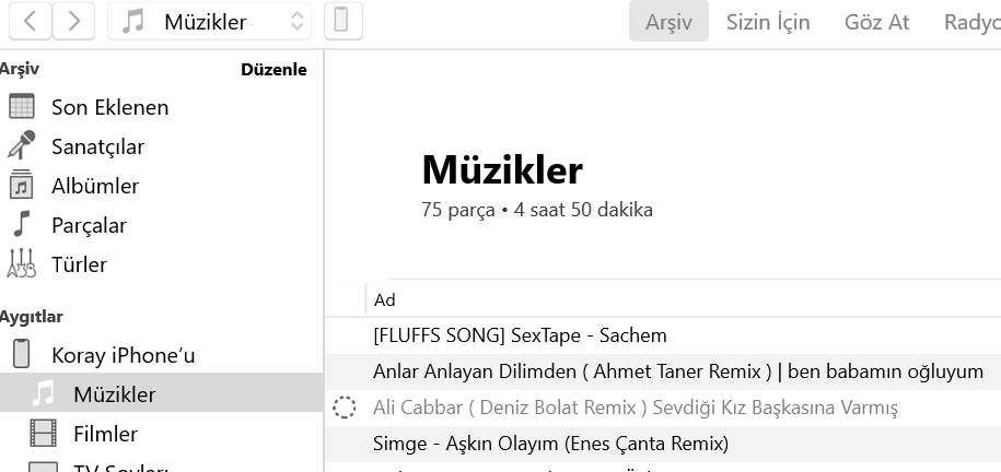 iTunes üzerinden iPhone telefonuma şarkı eklemek istediğimde fotoğraftaki gibi gri renkte kalıyor. Silmeye çalıştığımda da silemiyorum, telefonumda da zaten görünmüyor. Birkaç araştırma yaptım ama herhangi bir şekilde çözüm bulamadım. Sorunu çözüme kavuşturmuş arkadaşlar varsa yardım rica ediyorum.