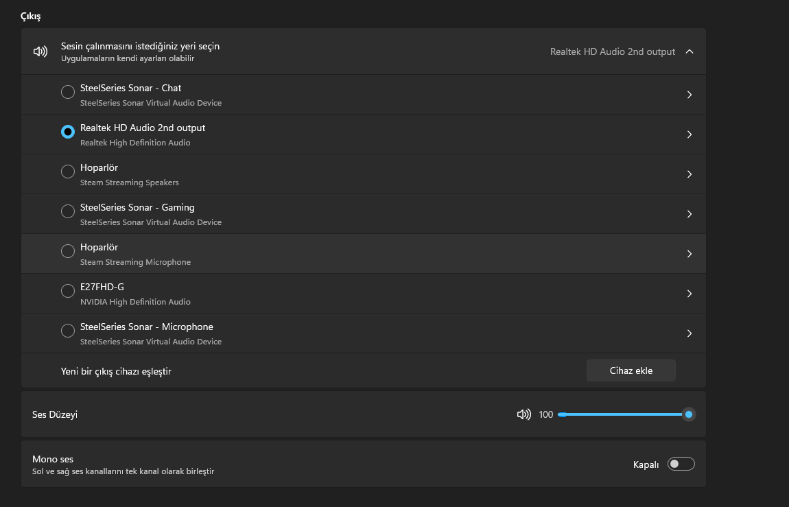 kapattım çoktan ama olmuyor işteSistem ses kulaklık seçeneklerin altında mono ses diye bir şey olacak onu kapatır mısınız lütfen.
