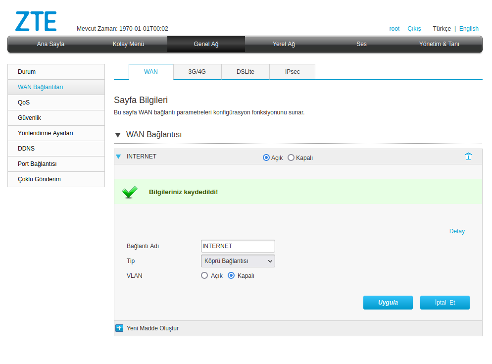 Daha sonra ınternet menüsünü genişletip vlan seçeneğini kapalı olarak işaretleyip uygula tuşuna basın.