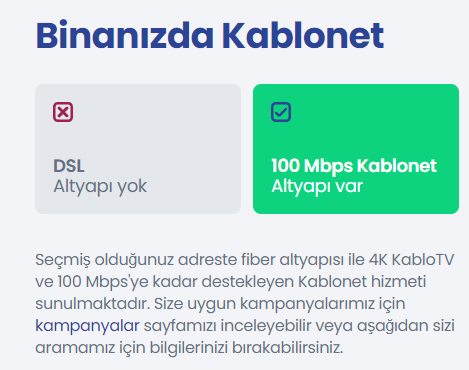 Öncelikle kafam biraz karışık. Yeni bir eve taşınacağım ve TurkNet üzerinden altyapı sorguladığımda fiber altyapı olmadığını, VDSL 61Mbps'lik bir altyapı desteklediğini gösteriyor. Site yöneticisi ile konuşurken sitede herkesin Kablonet kullandığını söylemesi üzerine bir de ona bakayım dedim ve ekran görüntüsünde gördüğünüz gibi fiber olduğunu ve 100Mbps'ye kadar desteklediğini söylüyor. Bunlar aynı altyapıyı kullanmıyor mu? Nasıl hem VDSL hem fiber altyapı oluyor? Birisi beni ciddi anlamda aydınlatırsa çok sevnirim.
