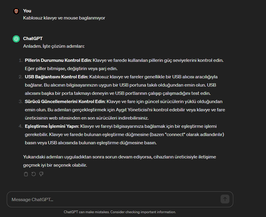 Bu adımları denedikten sonra klavye ve farenin çalışıp çalışmadığını kontrol et. Eğer üçüncü seçenek'de zorlanırsan bana tekrar yaz ve mouse, klavye markalarını belirt. 😊