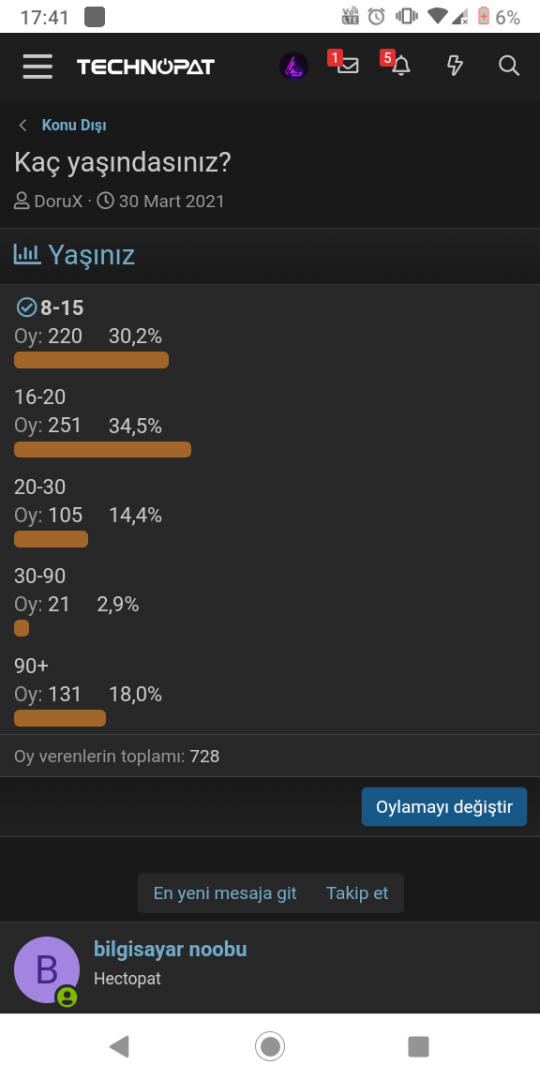 Ortalama yaşlı.14 yaşındayım ama 15 diye tanıtıyorum kendimi. Forumda 90+ olan seçenek 131 oy alması çok garip büyük ihtimalle troll.