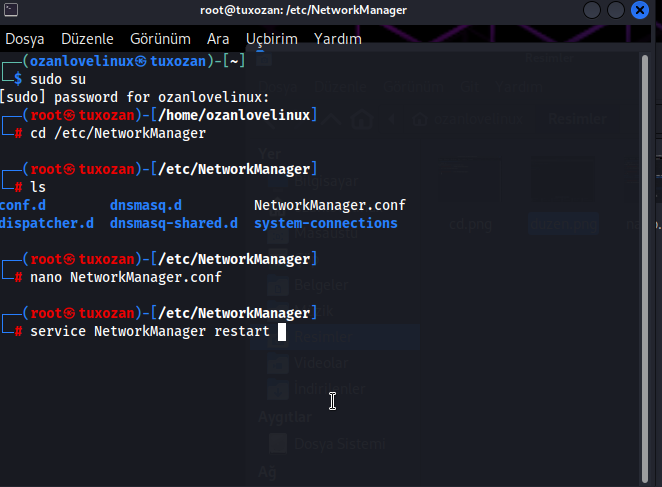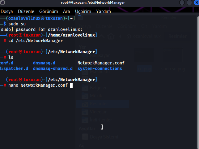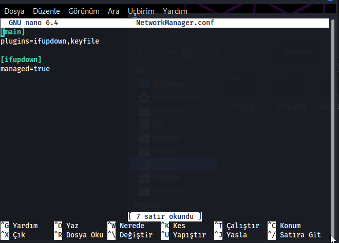 Diyerek, nano programı ile "networkmanager. Conf" adlı dosyayı düzenliyelim.