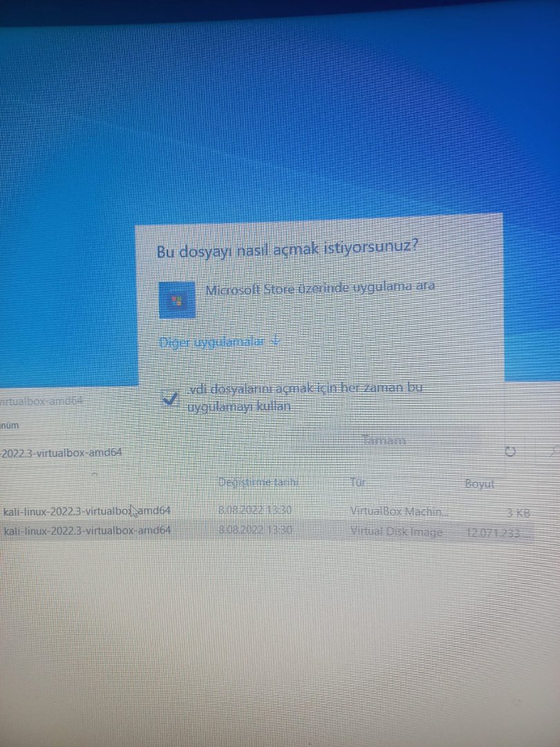 Kali'yi indirdim fakat VirtualBox için etkinleştirmek istediğimde Kali için "bu dosyayı nasıl açmak istersiniz" diye çıkıyor ve bunun hakkında hiçbir şey yapamadım acaba yardımcı olur musunuz?