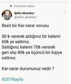 Ama sondaki 80 liraya satışı atladınız.İşlemleri birbirinden bağımsız durumlar olarak ele aldığımızda kâr 20 lira. Ancak 50 liraya aldığı ürünü 60 liraya sattıktan sonra 70 liraya almak için 10 lira daha eklediğini düşünürsek sonuç olarak kâr 10 lira olur. Yanlış düşünmedim umarım ki.