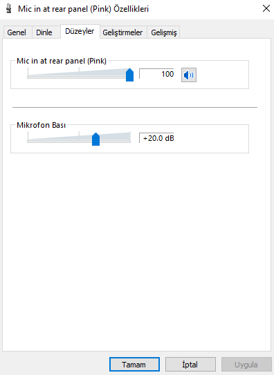 Buradaki bütün ayarları bu şekilde yapmayı denediniz mi? Burayı bulmak için Windows 10'da Sağ altta bulunan ses simgesine tıkladıktan sonra ses efektine girin. Kayıt sekmesinden aktif olan mikrofonunuza çift tıklayın.