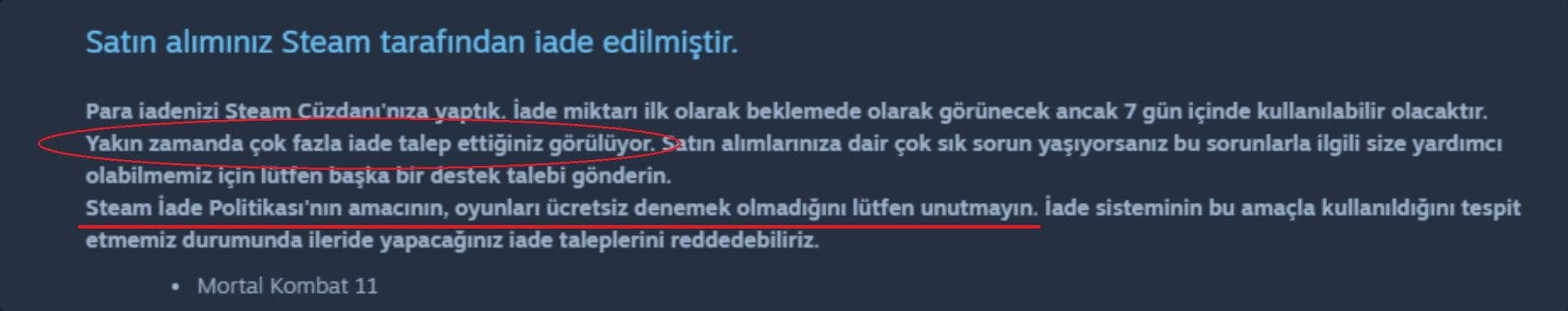 Merhaba, Mortal Kombat 11, Sons of The Forest ve Crysis paketini iade ettim az önce MK11 iadesi gerçekleşmiş ama kart yerine cüzdana yapmış. Neden bilmiyorum, nasıl karta attırabilirim? Nays ile aldım oyunu. Bu ay Max 2-3 iade yapmışımdır hepsi ucuz oyun idi 0 saatli.