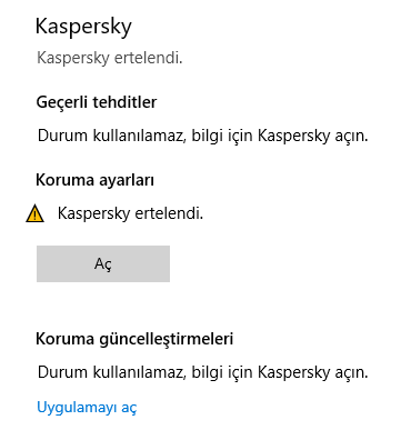 Merhaba arkadaşlar. Dün Kaspersky Anti-Virüs korumayı sildim. Bilgisayarı yeniden başlattım virüs programı silinmemişti. Denetim Masası'na bakıyorum orada gözükmüyor. İnternetten Kaspersky'ın kendi sitesinden "removal tool for Kaspersky applications (kavremover)" yükledim oradan sildim bilgisayarı yeniden başlattım hala silinmedi. Bu program yüzünden Windows Defender'ı kullanamıyorum. Bu programı nasıl kaldırabilirim?
