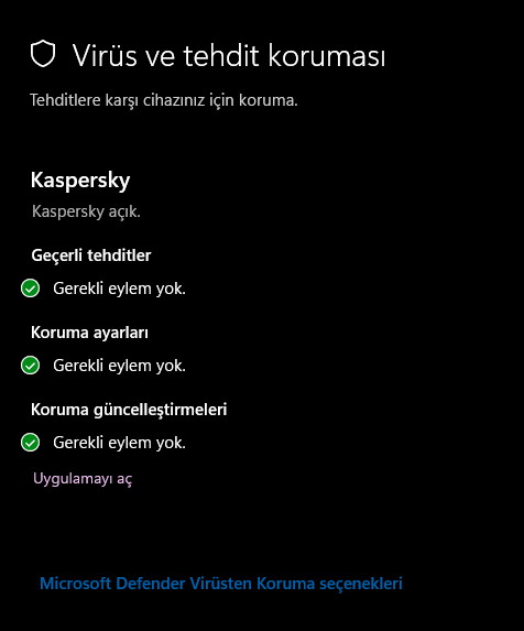 Yani anlatmak istediğim o ikon aslında Windows Defender ikonu değil antivirüsün çalışmasını sağlayan aracı gibi bir şey. Kaspersky'ı bilgisayardan kaldırırsan bu sefer Windows Defender onun yerini alıyor ve o arayüzden Windows Defender'ın kurulu olduğunu görüyorsun. Biliyorum tam anlatamadım ama Kaspersky sende çalışıyor merak etme.
