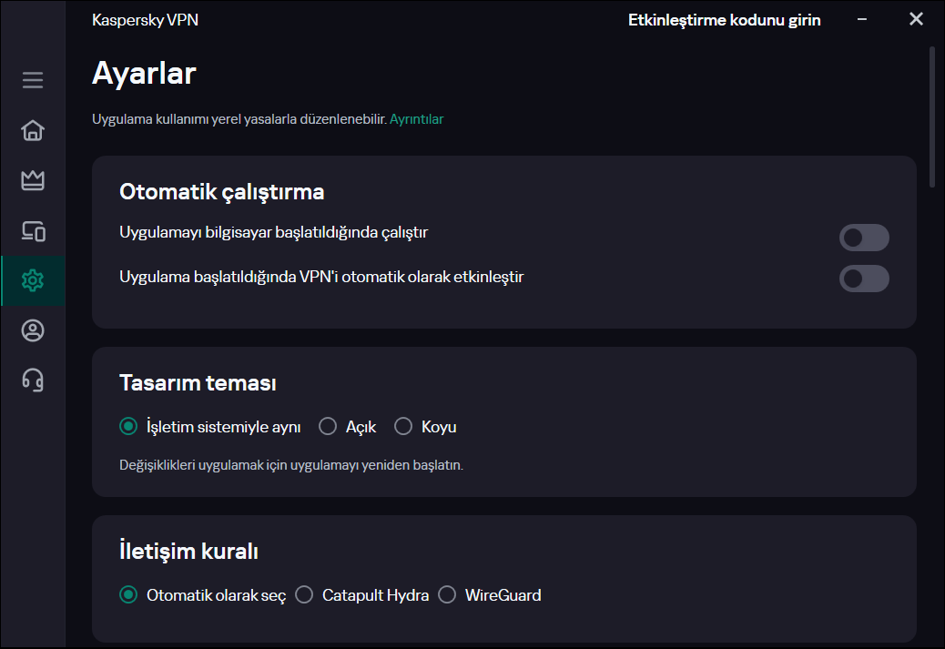 Ayarlardan "İletişim Kuralı"nı "Wireguard" seçerek deneyebilir misiniz? Olmazsa bir de "Catapult Hydra" deneyin.