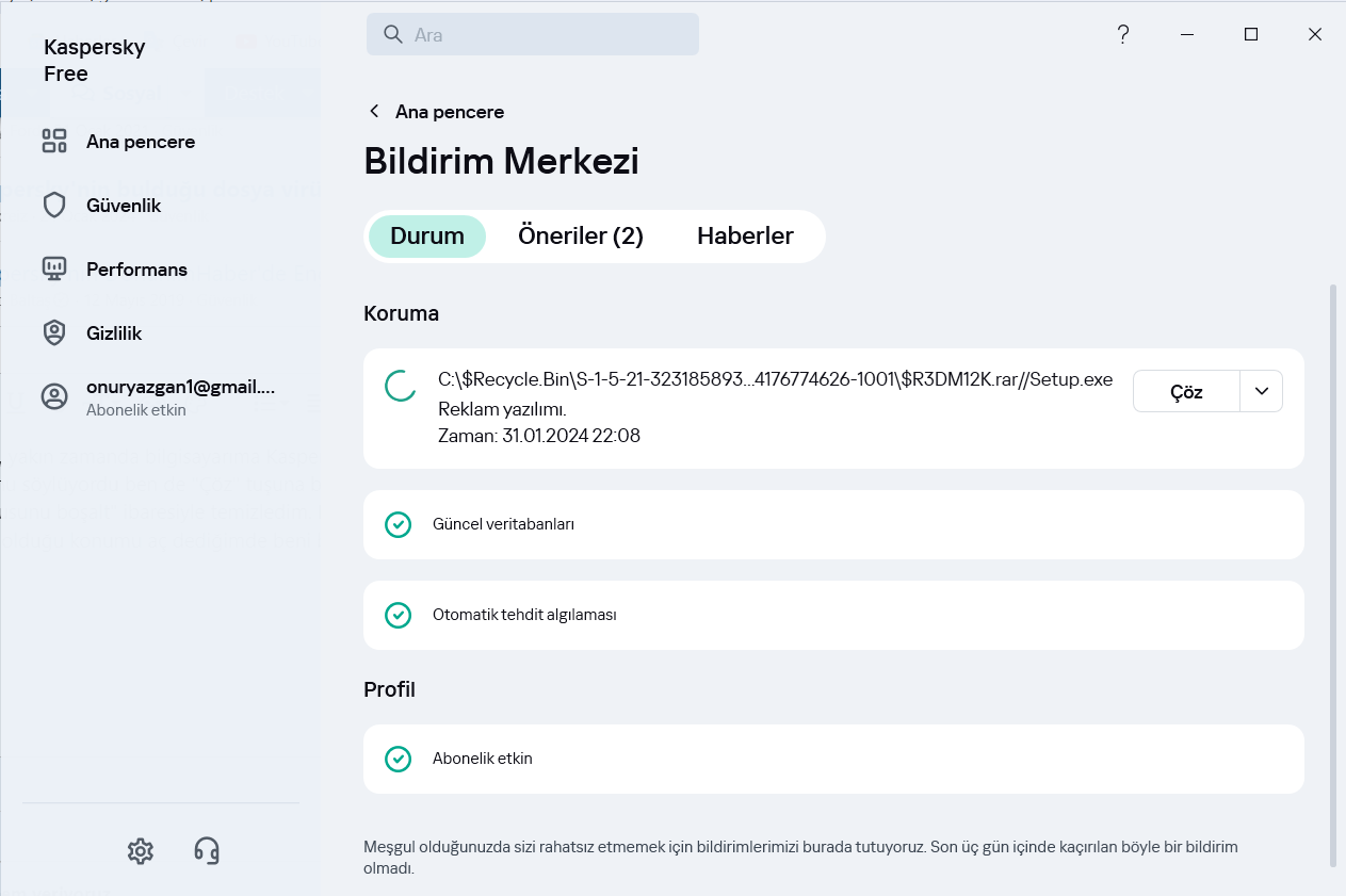 Merhaba, yakın zamanda bilgisayarıma Kaspersky yüklemiştim ve son birkaç gündür gözüme çarpan bir bildirim vardı. Bugün tıklayıp baktığımda ise bir reklam yazılı bulduğunu söylüyordu ben de "çöz" tuşuna basmıştım. Saatler sonra hala çözülmemiş olduğunu gördüm ve geri dönüşüm kutusunu manuel olarak temizledim. Yani "çöp kutusunu boşalt" ibaresiyle temizledim. Bundan sonra hala Kaspersky benzer bir mesaj veriyor mu diye kontrol ettiğimde yazılımı hala bana bildirdiğini gördüm. Yazılımın olduğu konumu aç dediğimde beni boş olan çöp kutusuna atıyor. Ne yapmalıyım?