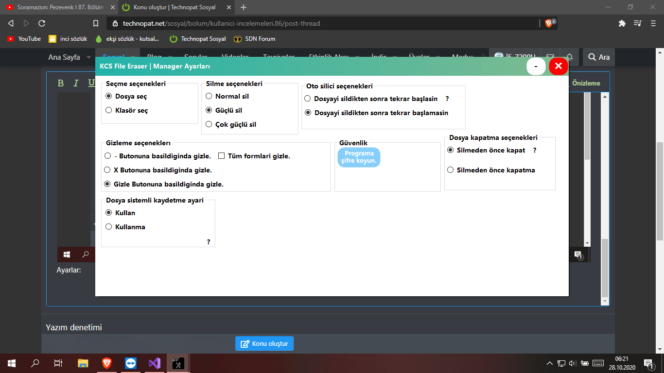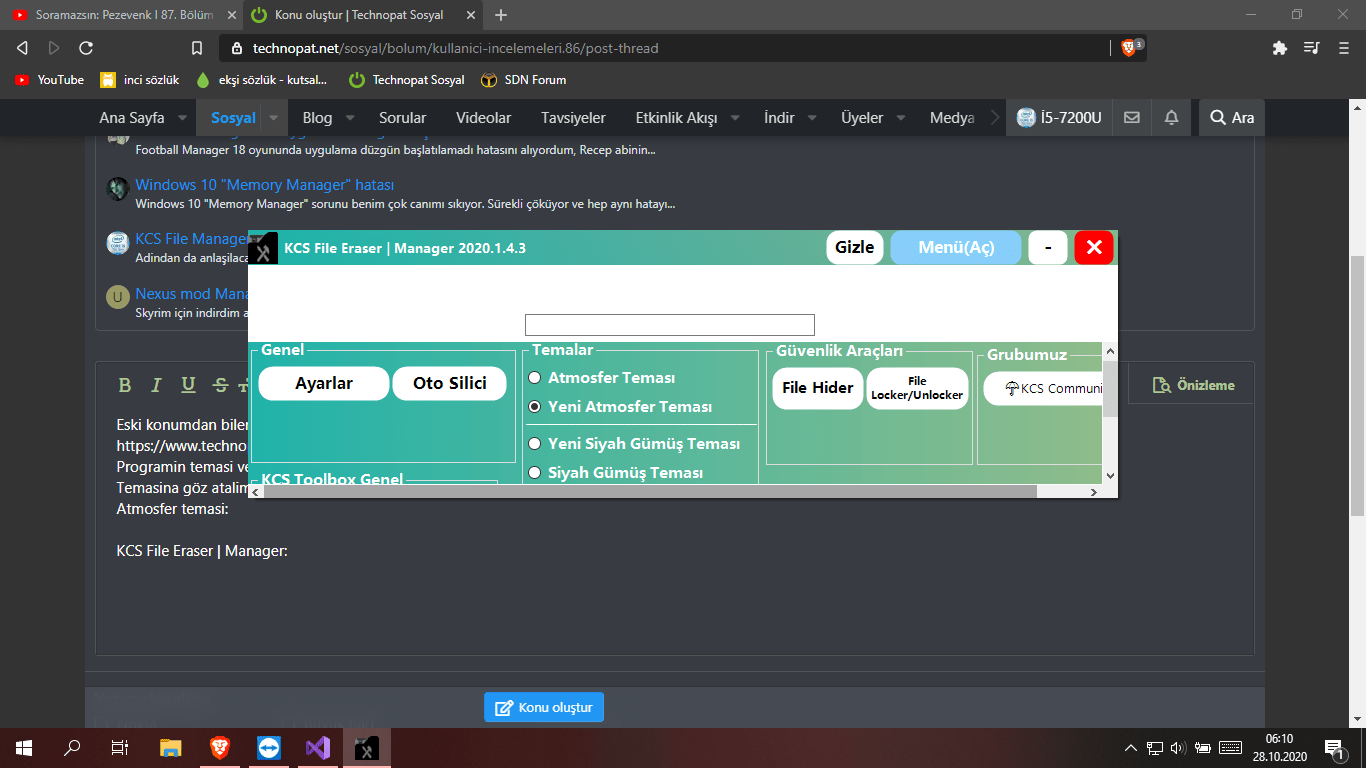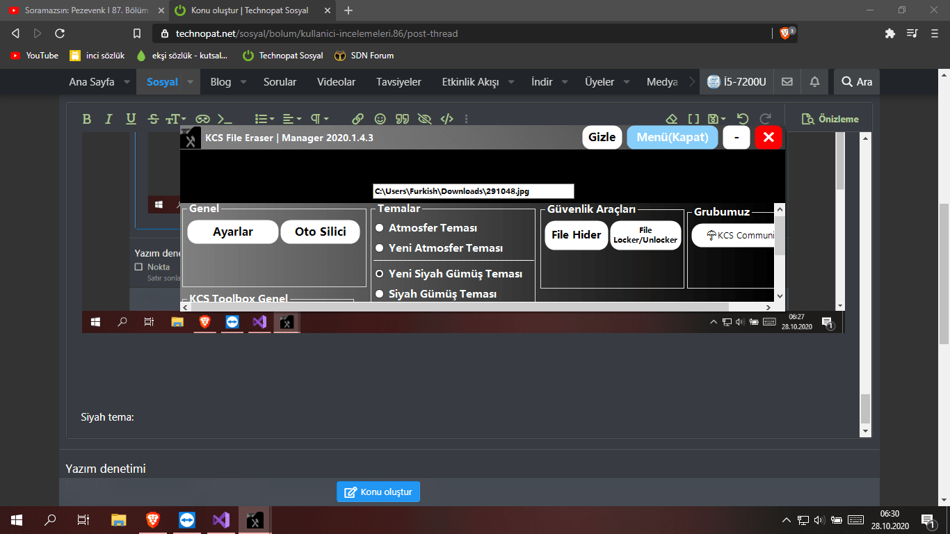 Adindan da anlaşilacaği üzere bir dosya yöneticisidir. Dosyalar üzerinde farkli işlemler yapabilirsiniz. Arayüz: Siyah gümüş temasi. Atmosfer temasi. Ayarlar: Oto silici: Dosya gizleyici: Dosya kilitleyici: (Geliştirilme aşamasindadir.) Programa her türlü eleştiriye açiğim...