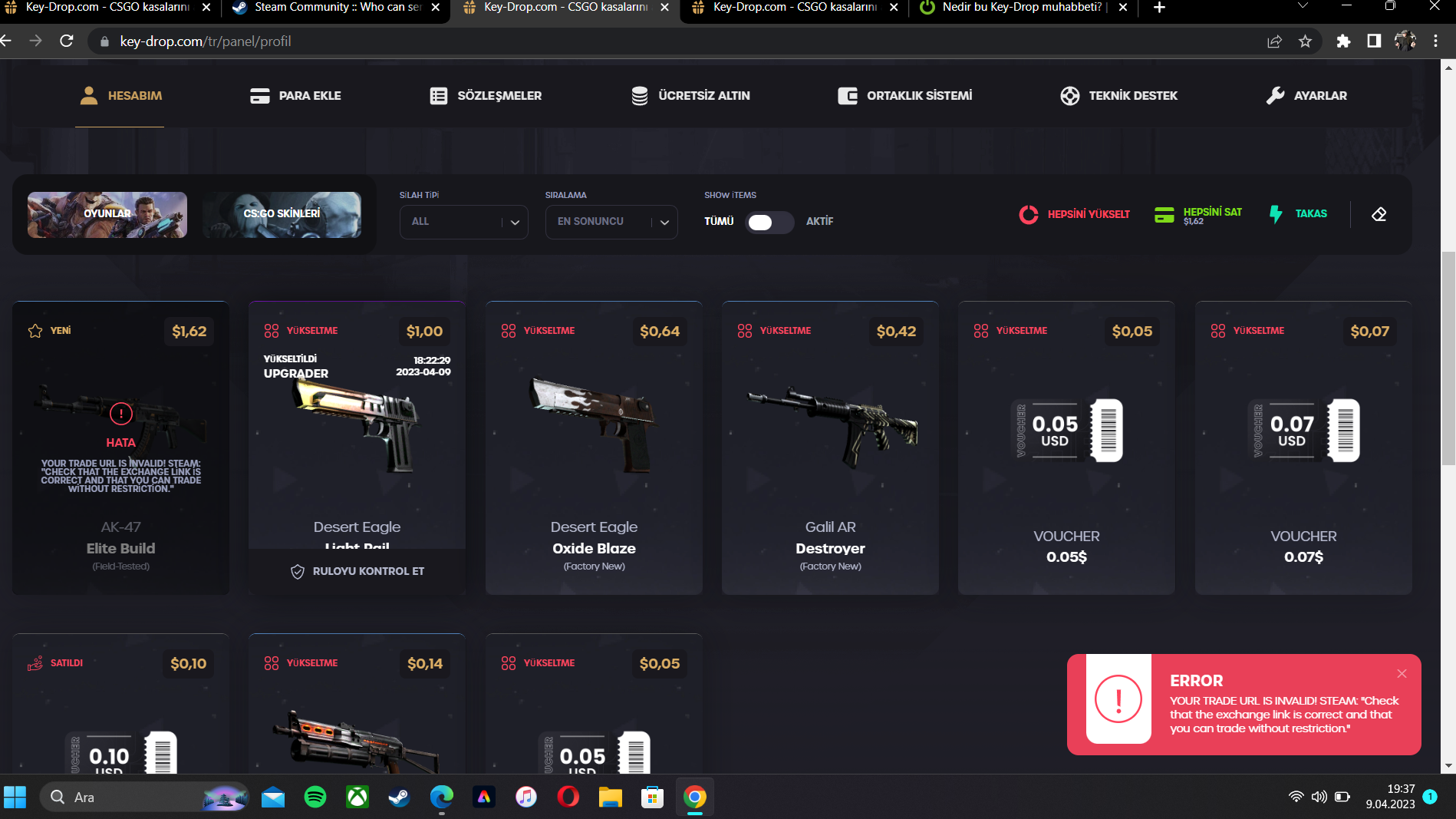 Keydrop'ta skin çekerken "trade URL invalid" hatası