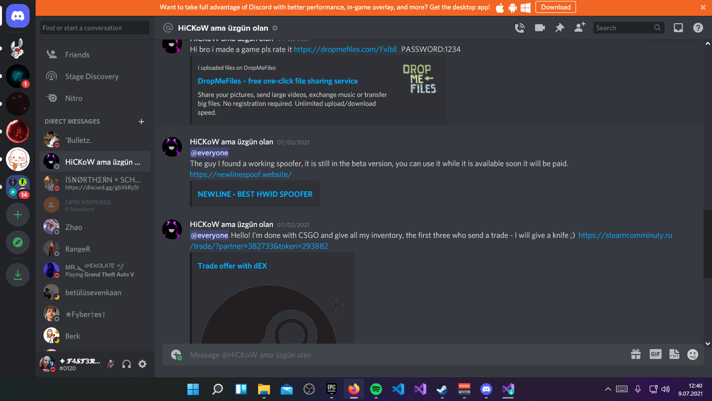 Format attıktan 2 gün sonra Discord hesabımdan arkadaşlarıma virüslü bir Steam linkini mesaj olarak göndermişler ama kimin gönderdiğine dair en ufak bir bilgim yok.
