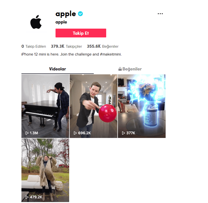 Günümüzde çoğu kuruluşun TikTok hesabı açtığını duyuyoruz. Apple'ın da nisan ayında açtığı TikTok hesabından ilk videolar paylaşılmaya başlandı. Anlaşılan o ki Apple TikTok'ta oldukça aktif olmaya devam edecek. Şu anlık paylaştığı içerikler iPhone 12 mini tanıtımlarından ibaret. 379 bin takipçeye ulaşan Apple'ın TikTok hesabı bu haberlerle birlikte #makeitmini isminde yeni bir challenge da başlattı. #Makeitmini etiketiyle yapılan paylaşımlar her dakika artıyor. Kendilerine TikTok konusunda başarılar diliyoruz. 🙂
