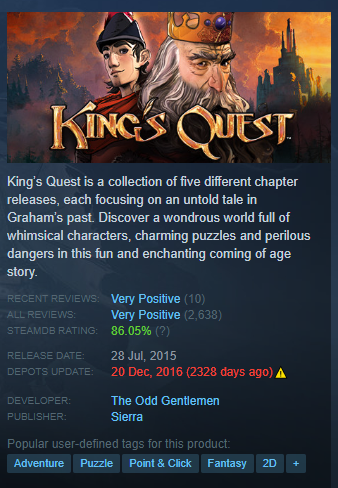 Steamde indirimlerle 40 TL yi bulan macera oyunu King's Quest durmaplay'de 10 tl ye alınabilir durumda. İlk bölümü ücretsiz olan macera oyununun ilk bölümünü steam üzerinden deneyebilir, beğenirseniz tüm bölümlerini içeren King's Quest: The Complete Collection (kendim aldım herhangi bir problem yaşamadım) aşağıdaki bağlantıdan alabilirsiniz.