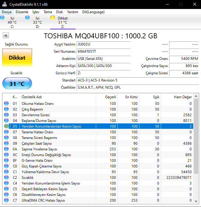 Sağlık durumu normal, diskinfo programında yukarıdan yazan değer bir garip sadece. Sağlıklı diske %0 yazdığı da oluyor.