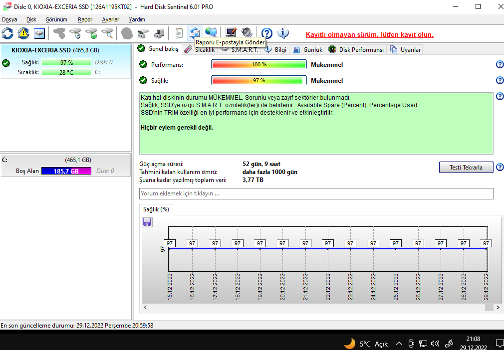 Performansta bir sıkıntı yok.Cevabınız için teşekkürler.Gayet normal bende de %97, önemli olan sağlığı değil performansı, performansında bir düşüklük hissedersen o zaman sıkıntı. O sağlık oranı SSD'nin yazma oranına göre belirleniyor sanırım. Ne de olsa ömürleri yazmaya göre.
