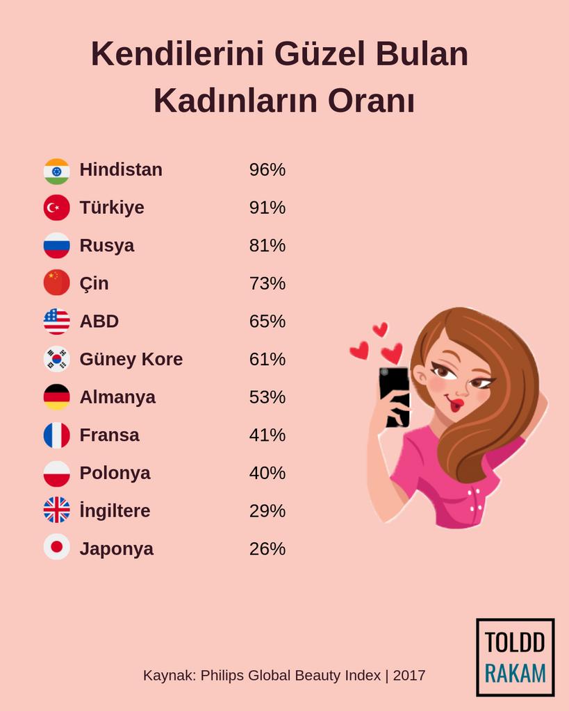 Aşağıdaki sürprizbozan içerisindeki görselde ülkelere göre kadınların kendini güzel bulma oranları yer alıyor. Türkiye'de her 100 kadının 91'i kendisini güzel buluyor. Rusya'da bile 100 kadında 81 bu oran.