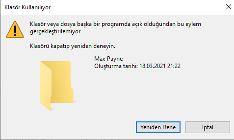 Görev Yöneticisi üzerinden bu klasörünü içindeki bir uygulama çalışıyorsa kapat.