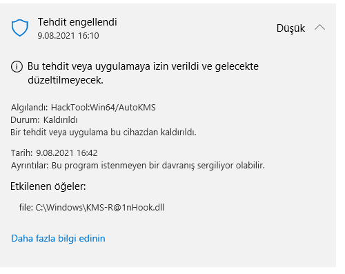 Crackli Windows kullanıyorum bilgisayarıma virüs mü girmiş yoksa crackli Windows kullandığımdan mı böyle? Endişelenmeli miyim yoksa sıkıntı yok mu? Geçen yine tam tarama yaptım ve bunu gördüm sonra tehditi kaldır dedim Windows Defender'dan ama şimdi tekrar gördüm ve yine kaldır dedim. Şimdi restart atacağım bilgisayara ve yine görürsem bilgielndireceğim.