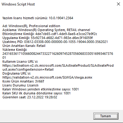 Yani arkadaşın anlatmak istediği KMS resmi yöntemdir ama KMSpico programı zararlıdır. Her KMS yazan da virüs değildir. KMSpico zararlısı anti-malware programlarla tespit edilebilir. Burada önemli olan "slmgr /xpr" komutudur. Eğer kalıcıysa sıkıntı yok. Eğer süreliyse işte o zaman KMSpico kullanılmıştır.