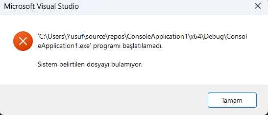 Kod çalışmaya başladığı zaman uygulama "Visual stüdyo .exe başlatılamadı" hatası veriyor