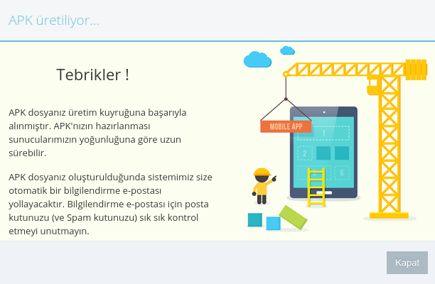 Ve uygulamamız hazır olduğunda bize e-posta ile uygulamamızı gönderiyor.