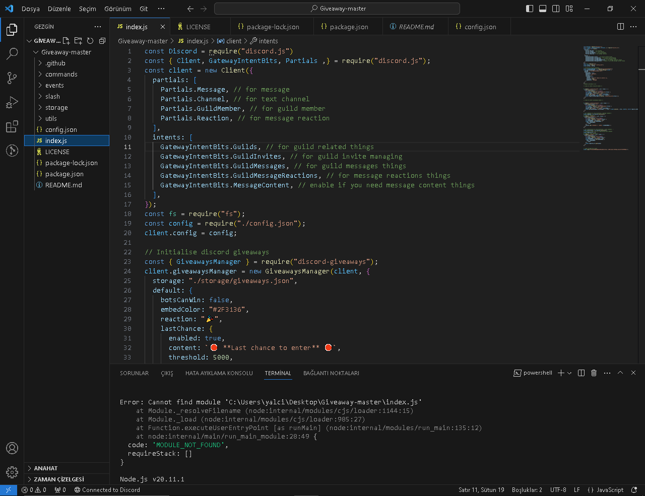 Discord'da çekiliş botu yapıyordum ama sürekli bu hatayı veriyor Node index.js yazıyorum bu hatayı veriyor.