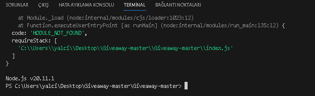 Terminale cd Giveaway-master yazdıktan sonra node index.js yazın. Doğru dizine geçmiş olursunuz ve hata vermez.