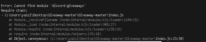 Bu seferde size discord-giveaways kütüphanesi yüklü değil diyor. Node.js de bir kütüphaneyi indirmek için npm install library ya da kısaca npm i library yazarız. Bizim eksik olan kütüphanemiz discord-giveaways olduğu için npm i discord-giveaways yazarak bu hatayı çözebilirsiniz.