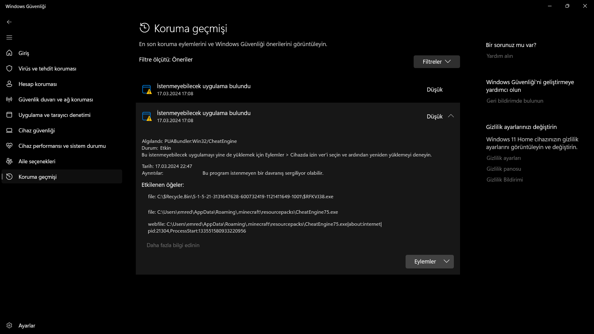 Resimlerde de görebileceğiniz gibi Cheat Engine adlı dosyada sorun yaşıyorum. 2 tane hata olarak gözüküyor. Herhangi birine basıp kaldır ya da karantinaya al seçeneğini seçince düzeliyor. Ancak ikincisi için işlem yaptığımda önceki de tekrardan hata gibi gözüküyor. Etkilenen dosyaların konumlarına baktım. Tamamen silinmişler. Gizli öge olarak da gözükmüyorlar. Harici bir antivirüs programı kullanmıyorum. Ne yapmam lazım?