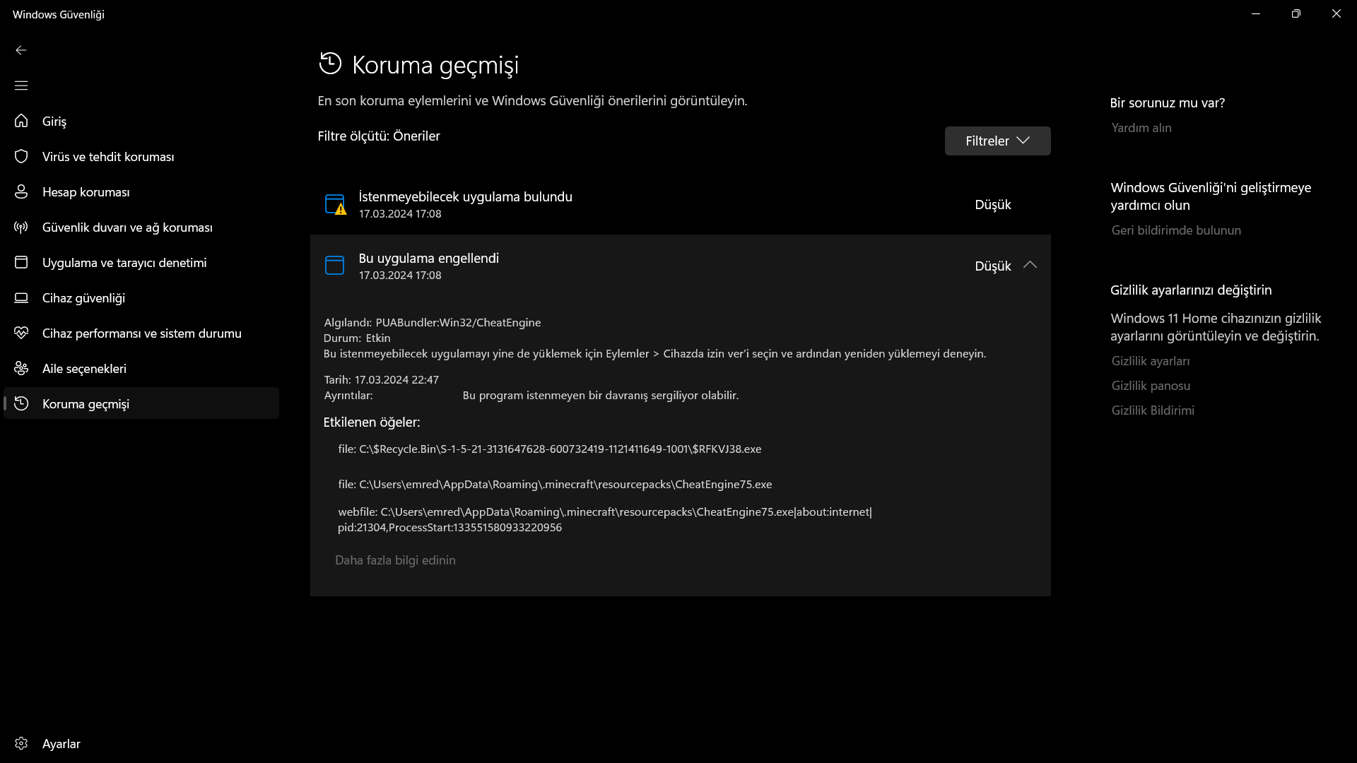 Resimlerde de görebileceğiniz gibi Cheat Engine adlı dosyada sorun yaşıyorum. 2 tane hata olarak gözüküyor. Herhangi birine basıp kaldır ya da karantinaya al seçeneğini seçince düzeliyor. Ancak ikincisi için işlem yaptığımda önceki de tekrardan hata gibi gözüküyor. Etkilenen dosyaların konumlarına baktım. Tamamen silinmişler. Gizli öge olarak da gözükmüyorlar. Harici bir antivirüs programı kullanmıyorum. Ne yapmam lazım?