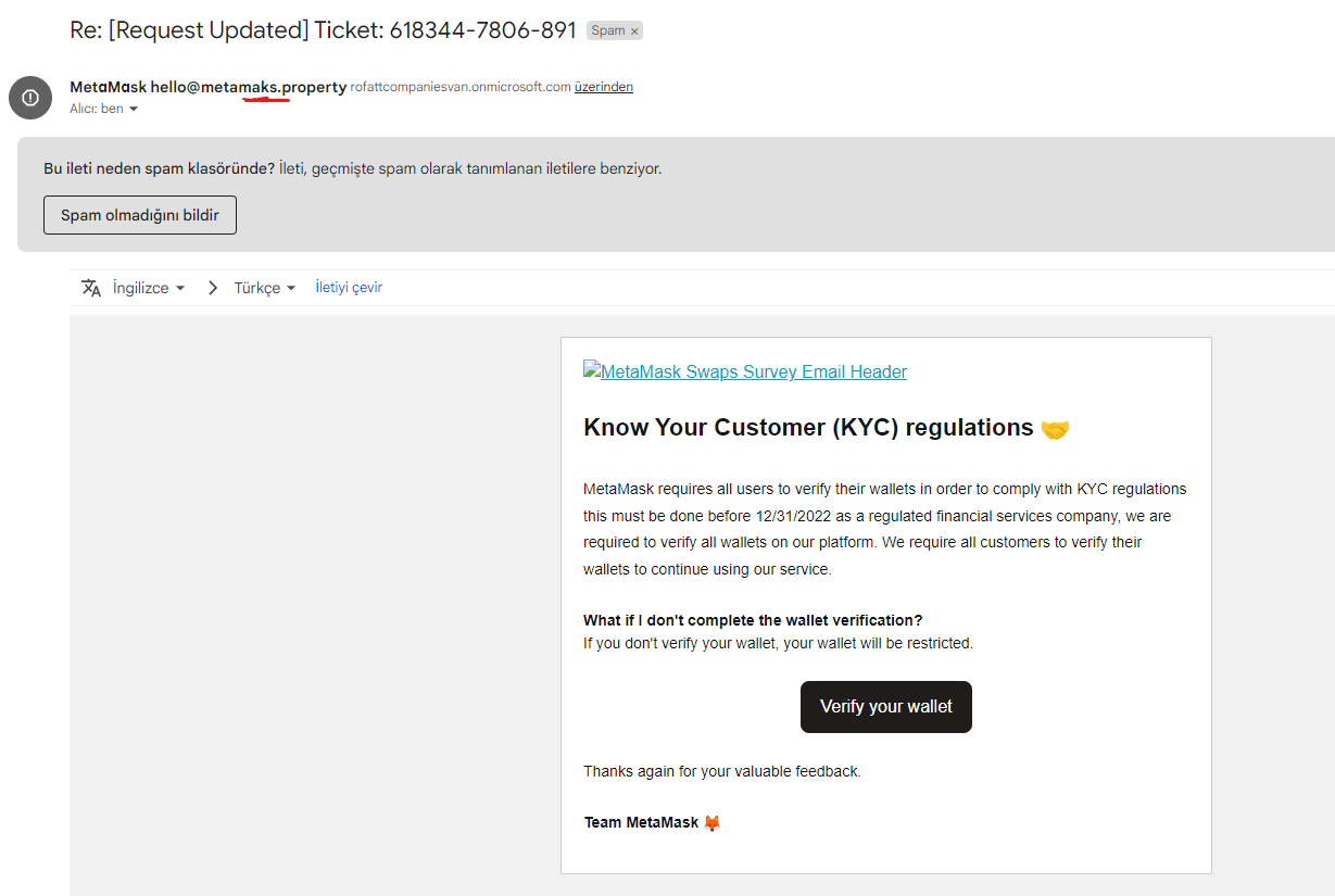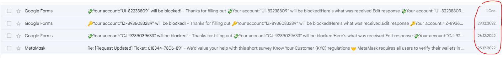 Bugün spam klasörümü kontrol ettiğimde 25 Aralıktan bu yana 4 tane gelen mail gördüm. İlk mail MetaMask adına gelmişti dolandırıcı olduğunu anladım mail metamaks idi. Fakat Google forms ile gelenler biraz şüphelendirdi 3 tane farklı günlerde gelmiş tahminimce dolandırıcı fakat tam emin olamadım herhangi bir link tıklama vs yapmadım aşağıda fotoğraflar var bana ne olduğundan bahsedebilir misiniz? Şimdiden teşekkürler cevaplarınız için.