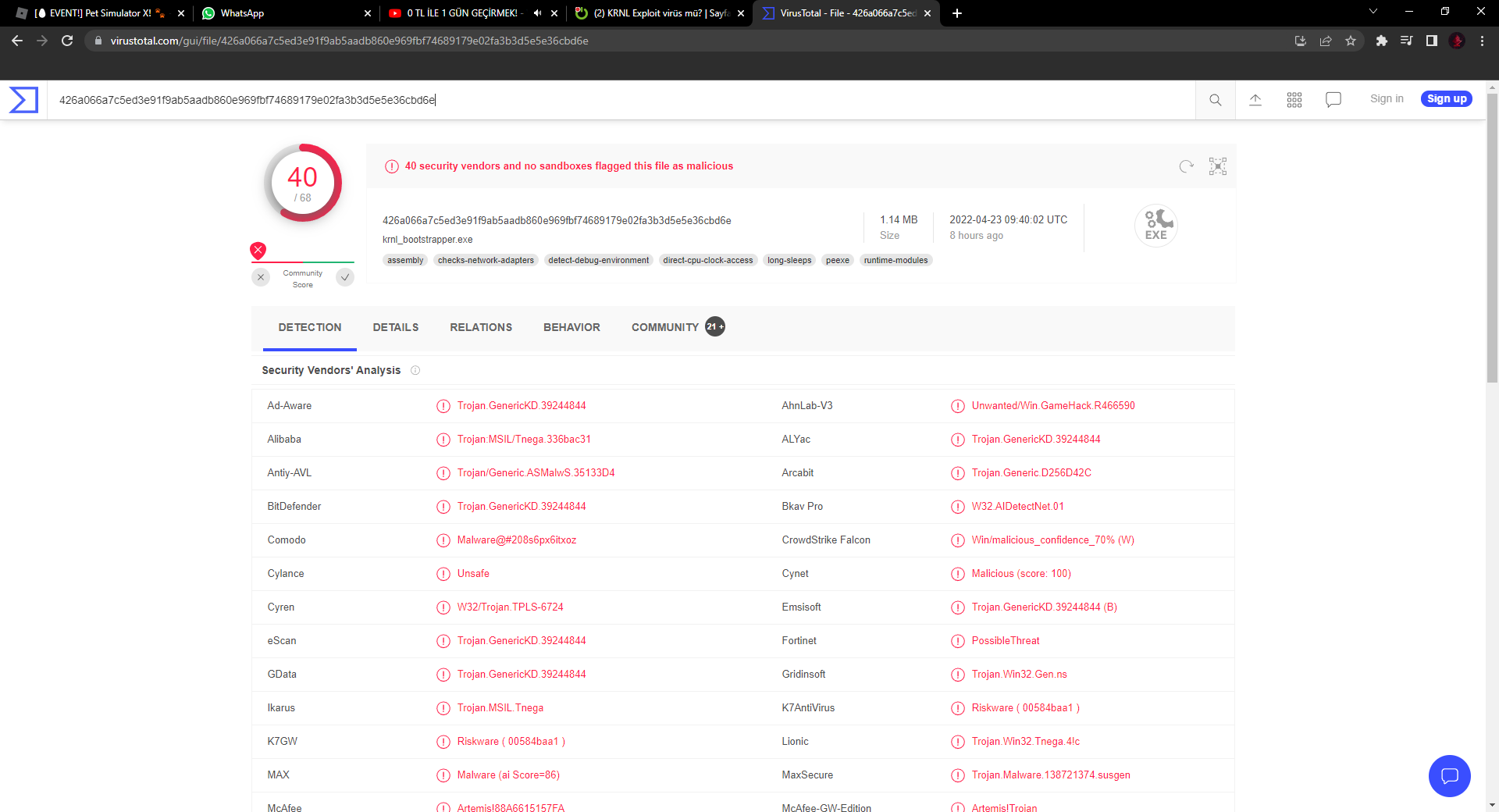 Hocam ALLAH aşkına görmüyormusunuz? 40 tane av virüs olarak algılamış. Araların da sağlam olan AV'ler de var. Hepsi de false positive çıkarmaz.