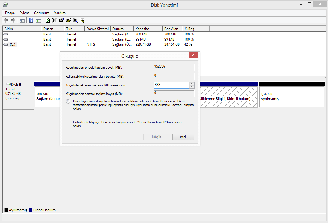 Windows 8.1' de diski bölemiyorum. 390 GB boş yer var ancak birimi küçült seçeneğine tıkladığım zaman çıkan 0 mb' ı arttıramıyorum. Yapanbileceğim herhangi bir şey var mı? W10' a geçmek için Steam ve Origin oyunlarını yedeklemek istiyordum.