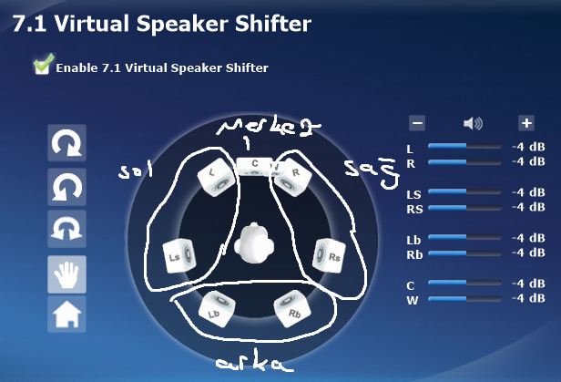 Gördüğünüz üzere sağ sol arka sesi 3 farklı parçada ve her biri kendi içinde 2'ye ayrılacak şekilde alıyor. Diyeceksiniz hayır sağ ve sol 3 farklı parça içinde ama merak etmeyin o left back ve right back olarak geçenler arkadan ses veriyor ve ön önce bulunan Center ve woofer işe yaramaz bir gösterge, 7.1 değil direkt 6 aslında. :D