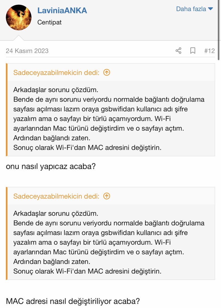 3 senedir KYK'da kalıyorum geçen haftaya kadar herhangi bir sorun yokken bu hafta bilgisayarım üzerinden gsbwıfı'ye bağlanamadığımı fark ettim, telefonum üzerinden çok rahat şekilde bağlanırken bilgisayarda neden böyle olduğunu çözemiyorum. MAC adresi değişikliği yapılması gerektiğini söyleyenler gördüm ama bunu da nasıl yapacağımı bulamadım.