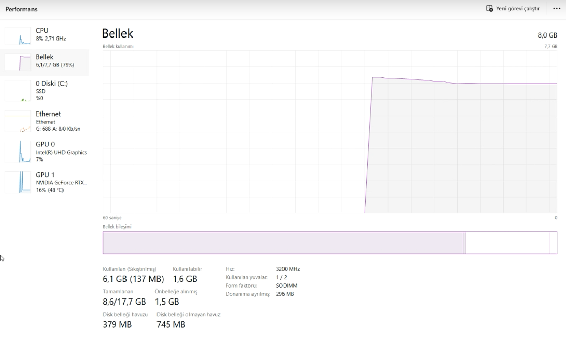 Arka planda Discord, Steam gibi uygulamalar açık ve 8 GB RAM yetersiz zaten. Sanırım bilgisayar açılırken otomatikmen açılıyor bu uygulamalar.