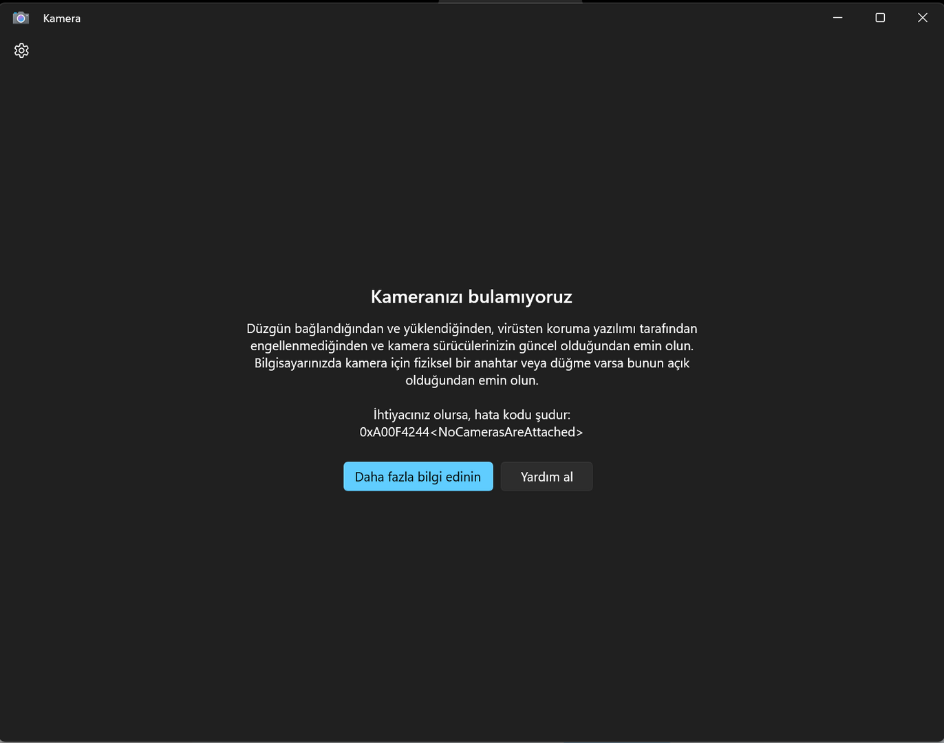 Selam, görüntülü toplantıya girecektim fakat kameramın algılanmadığını fark ettim. Bu bilgisayarı üç senedir kullanmama rağmen ilk defa bu sorunu yaşıyorum. Kamera uygulamasında da gözükmüyor, aşağıdaki gibi hata veriyor. Ayrı bir webcam kullanmıyorum, direkt olarak laptopun kamerası ile ilgili bir problem var. Nasıl çözebilirim?