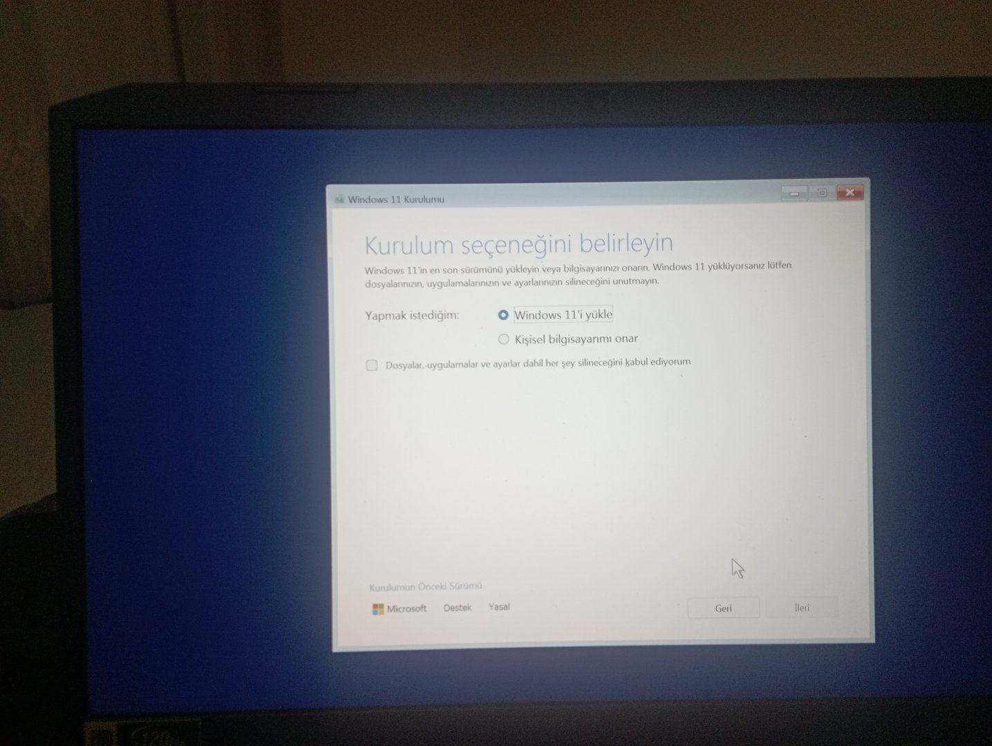Windows 11'i yükle seçeneğini seçin ve alttaki dosya silinme yazısını tikleyin.