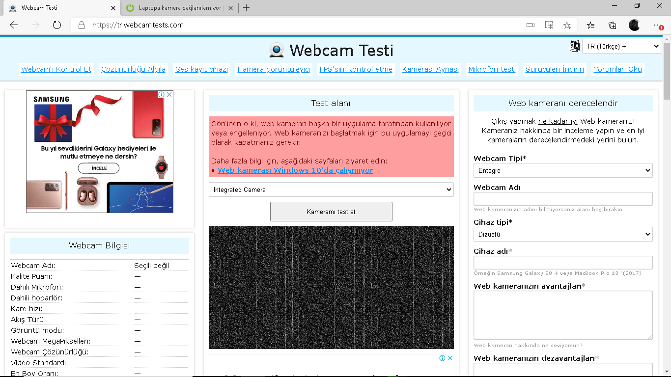 Merhabalar, laptop ıma nedensizce kamera bağlayamıyorum. Bağlayınca ve kullanmaya çalışınca diğer uygulamaları kapatın diyor.