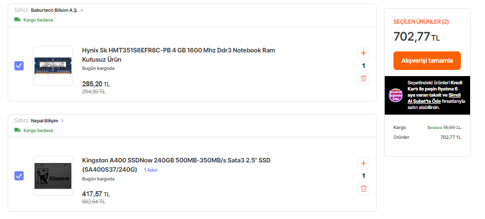 1.Hepsiburada'dan aynı model seri numaralası aynı olan RAM'i alacağım.