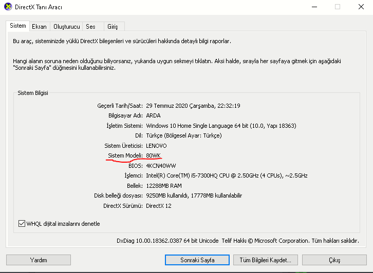 Tam olarak model belirtmeniz gerekiyor, arama çubuğuna dxdiag komutunu yazın.
