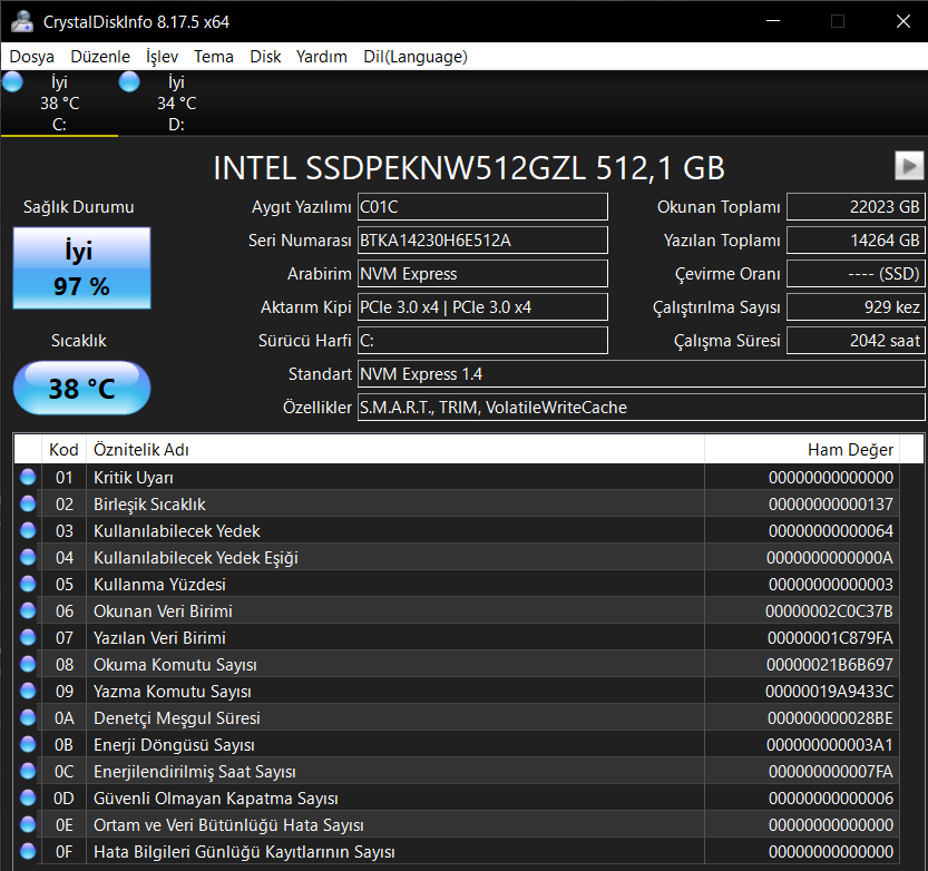 Elimde Lenovo 3060 R7-5800H laptop var. İçerisinde 500 GB SSD var ve yetmediği için yıllardır kullandığım iki gözümün çiçeği bir tane harici HDD var. Ancak çok eski ve içine yüklenen oyunun açılmasının ne kadar zaman aldığını tahmin edebiliyorsunuzdur. Laptop'da 2 tane SSD slotu var, bir tanesi boş. O boş olana 500, eğer çok ucuzuna denk gelirsem 1 TB SSD alacağım. Ancak okuma yazma hızlarına göre, markasına göre çok fark ediyor fiyatlar ve bilgim olan bir konu olmadığından forumdaki bilgisi olanlardan yardım almak için açtım bu konuyu. Eğer RAM'lerdeki gibi uyumluluk mevzusu varsa diye aşağıya aktif olarak kullandığım iki diskin Crystaldatainfo üzerindeki bilgilerinin SS'lerini bırakıyorum.