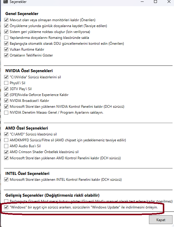 Sorunlu ekran kartının sürücüsünü kurmayın. DDU işleminden önce görseldeki kutucuğu işaretleyin.