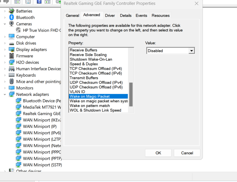 1 - Aygıt yöneticisine girin Realtek Gaming GBE family controllerda gelişmiş seçeneklerine gelin ve wake on ile başlayan hepsini devre dışı bırakın.