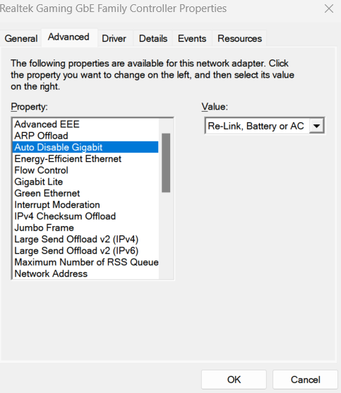 Yine aynı kısımda Auto disable gigabiti relink battery or AC seçeneğine alın.